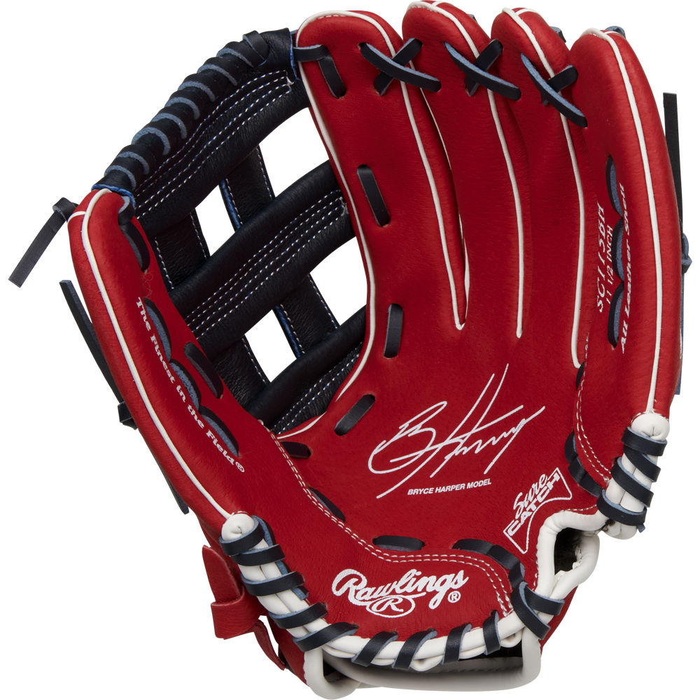 The Rawlings Sure Catchâ„¢ 11.5-Inch youth infield/outfield glove is constructed with a soft, all-leather shell for enhanced durability and pocket shape retention. Its Sure Catch heel cut out design allows for a quick and easy close making it perfect for young athletes who need a glove that’s game-ready off the shelf. Additionally, the cushioned finger linings offers added comfort and features a Velcro wrist strap for a custom fit. Bryce Harper Signature Model. Get yours today!